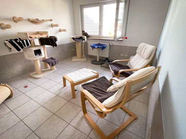 Alle Räume sind katzensicher eingerichtet. Das bedeutet: Katzengitter an den Fenstern und – im Falle des Kaminzimmers – ein komplett eingenetzter Balkon. Verschiedene Klettermöglichkeiten, Kratzbäume und Höhlen sowie Regalbretter an den Wänden bieten ausreichend Abwechslung für Spielen und Toben, aber auch Ruhe- und Rückzugsmöglichkeiten. Auf dem Balkon befindet sich ein großer Kratzbaum und genügend Schlafecken für etwas Ruhe in der Sonne.